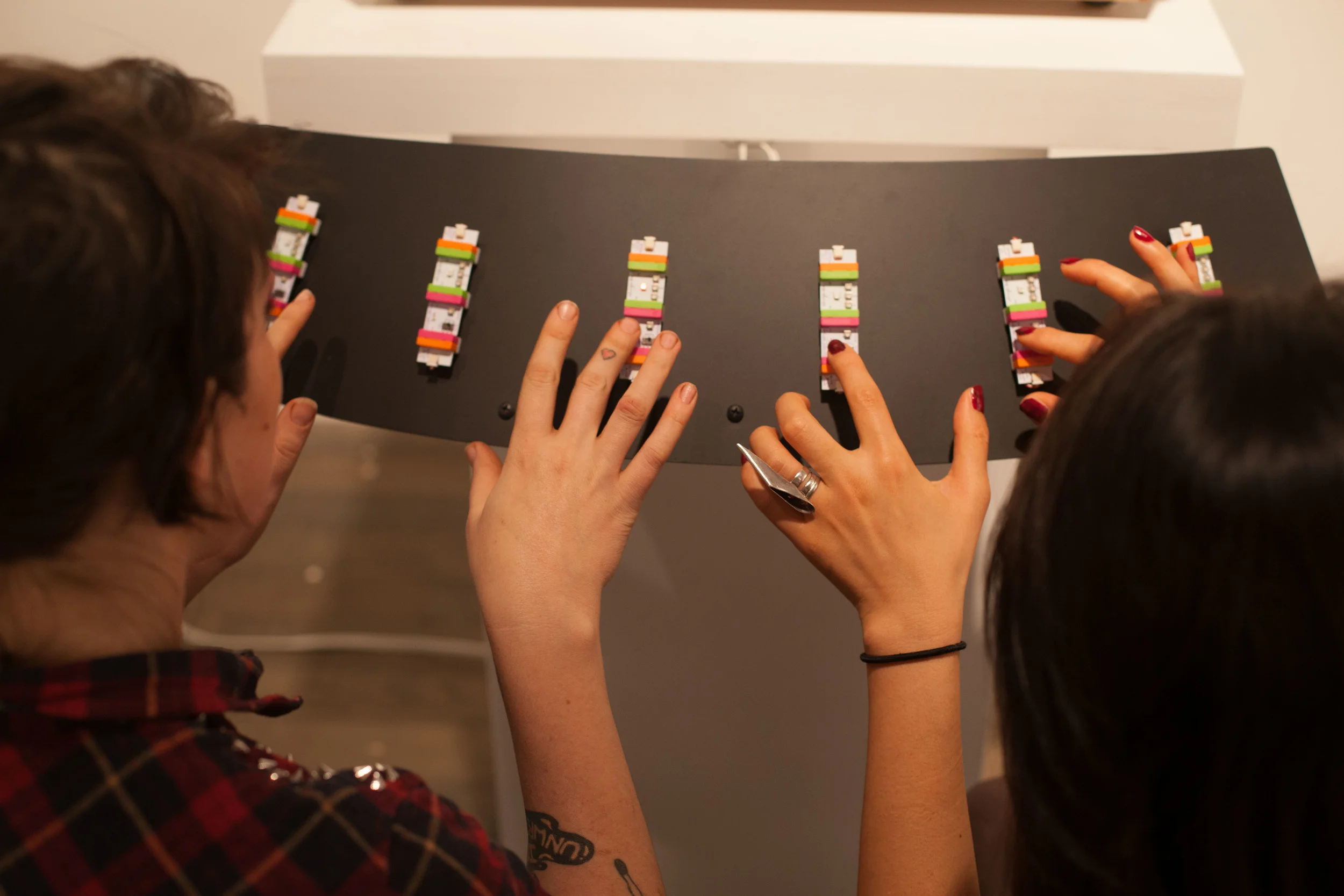 Light sensors from littleBits Electronics perceive changes in shadow from the viewers. As the shadows change and the sensors react, littleBits Arduino processors control custom circuitry inside the sculpture, which start and stop the electromagnets.